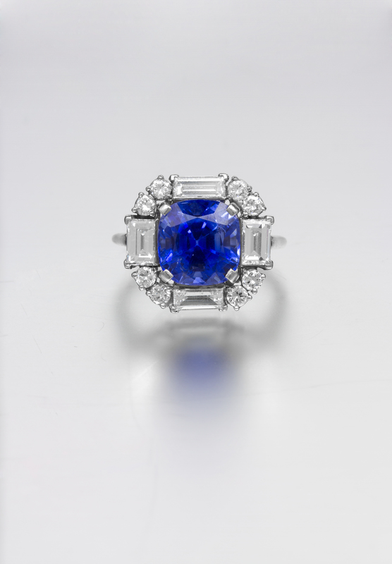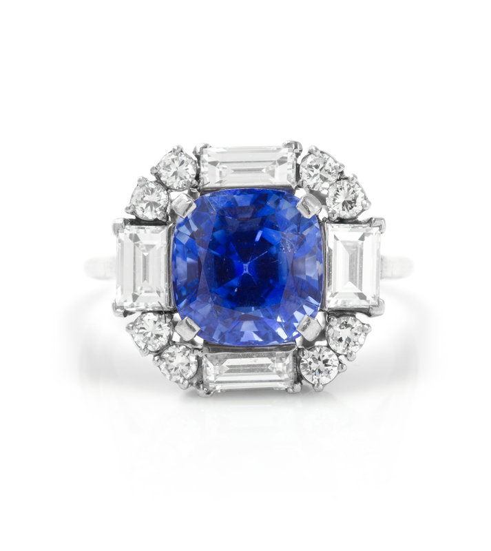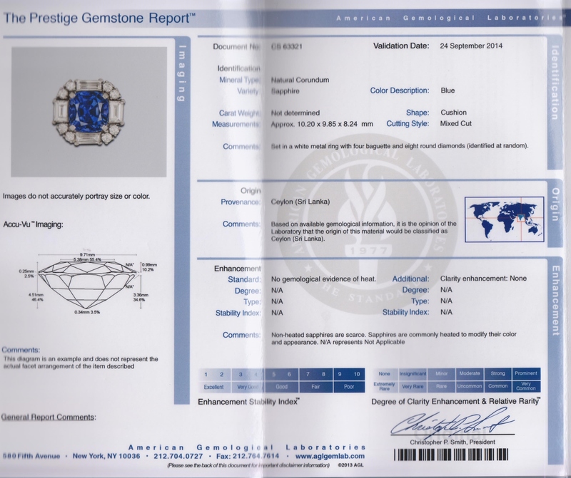 containing one square cushion cut sapphire measuring approximately 10.20 x 9.85 x 8.24 mm, four rectangular step cut diamonds weighing approximately 1.60 carats total and eight round brilliant cut diamonds weighing approximately 0.40 carat total within a handmade platinum setting with openwork double gallery, white gold lower shank.Accompanied by an American Gemological Laboratories sapphire identification and origin certificate number CS 63321, dated September 24, 2014, stating Mineral Type: Natural Corundum, Variety: Sapphire, Origin: Ceylon (Sri Lanka), Enhancement: No gemological evidence of heat, Clarity Enhancement: None.