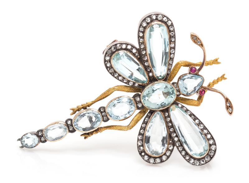 A Fine Belle Epoque Silver Topped Gold, Aquamarine, Diamond and Ruby Dragonfly Brooch, Fontenay, Circa 1883,