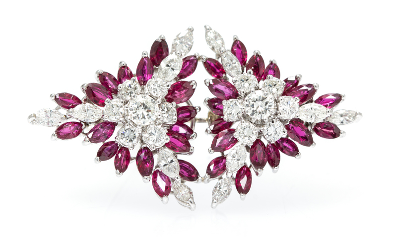 containing 14 round brilliant cut diamonds weighing approximately 1.80 carats total, 12 marquise brilliant cut diamonds weighing approximately 1.56 carats total and 36 marquise mixed cut rubies weighing approximately 4.80 carats total, converted from a pair of vintage earclips.Stamp: 750.