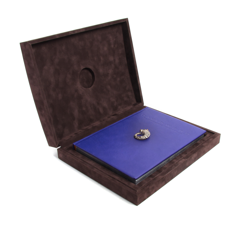 consisting of a lavishly bound book in a suede outer case, together with a sterling silver zebra motif pendant containing stripes of black and white enamel with two round cabochon cut emerald eyes bezel set in yellow gold, suspended from a black silk cord.Accompanied by a signed brown suede pouch for the pendant, the outer cardboard box for the book case, and a certificate of authenticity.