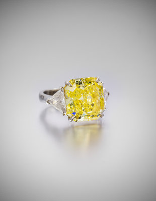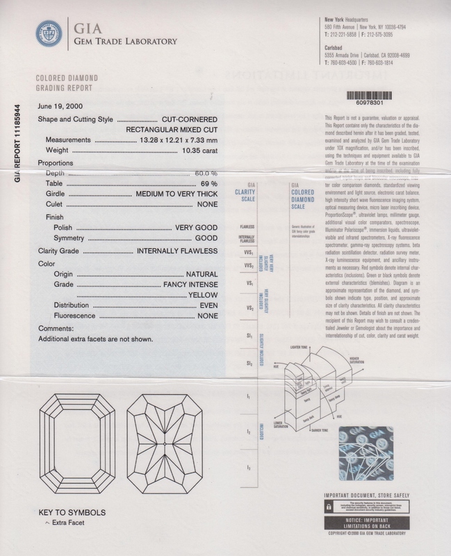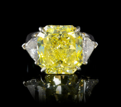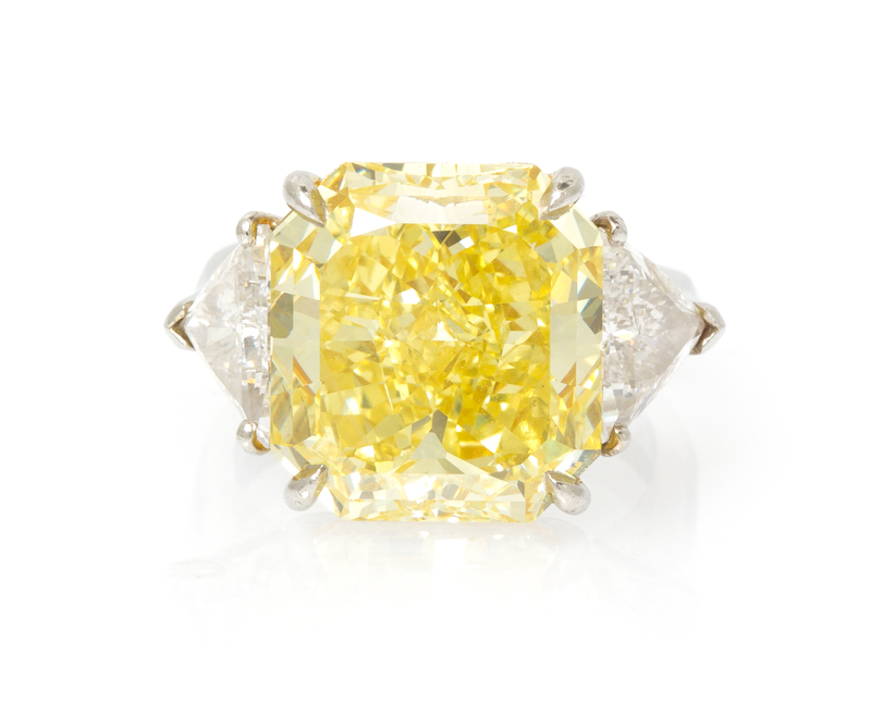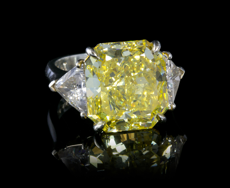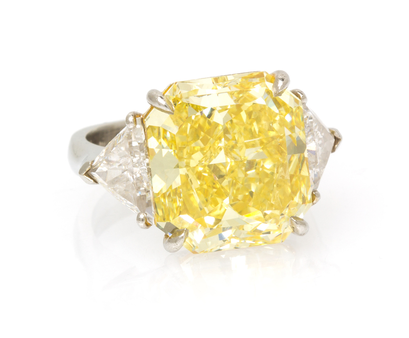 containing one radiant cut fancy intense yellow diamond weighing approximately 10.35 carats and two triangular modified brilliant cut diamonds weighing approximately 2.14 carats total.Stamp: Avedis PLAT.Accompanied by a Gemological Institute of America colored diamond grading certificate number 11185944, dated June 19, 2000, stating Color: Natural Fancy Intense Yellow, Even, Clarity: Internally Flawless, Polish: Very Good, Symmetry: Good, Fluorescence: None.