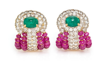 A Pair of 18 Karat Yellow Gold, Emerald, Ruby and Diamond Earclips,
