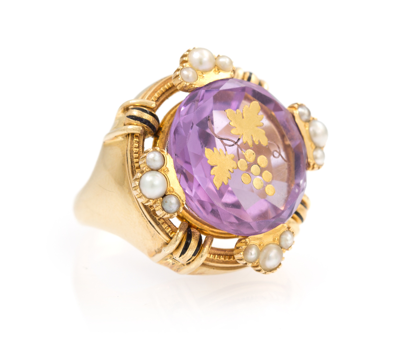 consisting of a centrally set round mixed cut amethyst carved and inlaid with gold to display a grape and vine design, the stone within a four prong surround accented with 12 round split pearls (origin not tested) above the millegrain edged circular base with black enamel detail.