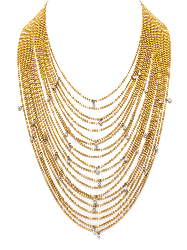 consisting of 20 beaded strands of graduated lengths punctuated at regular intervals with 87 round brilliant cut diamonds weighing approximately 1.83 carats total.Stamp: 14K C.P.