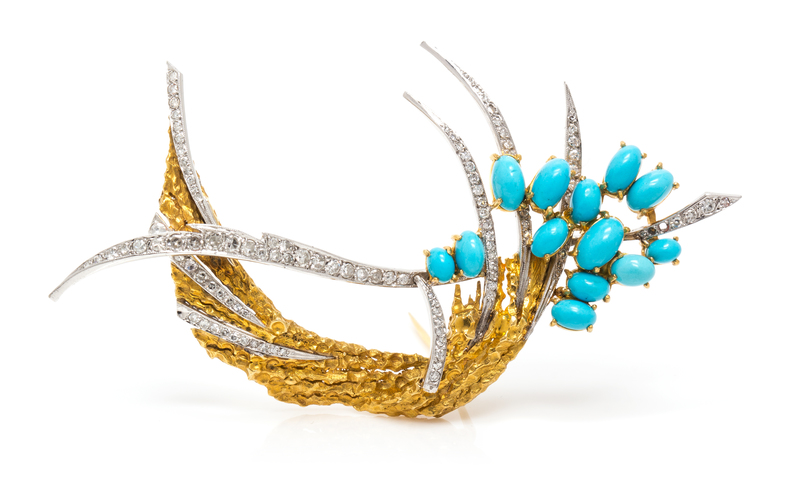 in a white and textured yellow gold freeform spray motif, containing numerous round single cut diamonds weighing approximately 1.09 carats total and 13 oval cabochon cut turquoise.