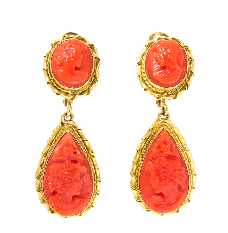 consisting of a brooch containing an orange coral cameo depicting a Classical youth in profile wearing a foliate garland on his brow, together with a pair of drop earclips containing two oval and two pear shape reddish orange cameos depicting profiles with elaborate coiffures within twisted rope texture collet settings.