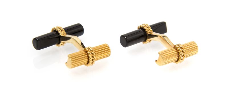 consisting of twisted rope texture hoops constructed to hold the interchangeable cylindrical hardstone accents, the hoops extending from the central polished curve bar sections and hinted fluted and rope texture backs, together with a pair of cylindrical onyx bars and a pair of cylindrical lapis lazuli bars.Stamp: (partially obscured French gold assay marks) (partially obscured maker's mark).