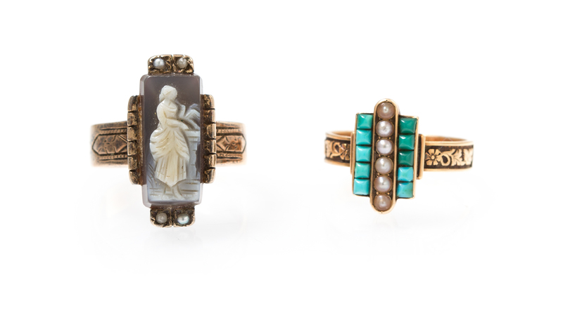 consisting of a 14 karat yellow gold ring containing six seed pearls and 10 buff top square turquoise above the foliate motif shank, together with a 10 karat yellow gold ring containing a hardstone cameo depicting a woman in a flowing dress accented with four seed pearls above the textured shank.
