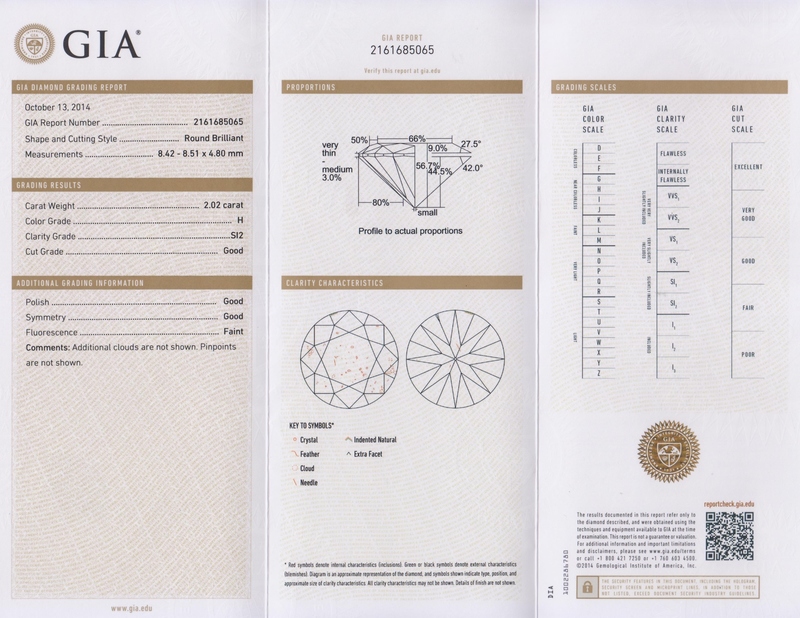 measuring approximately 8.42 x 8.51 x 4.80 mm.Accompanied by a Gemological Institute of America diamond grading certificate number 2161685065, dated October 13, 2014, stating Color: H, Clarity: SI2, Cut: Good, Polish: Good, Symmetry: Good, Fluorescence: Faint.