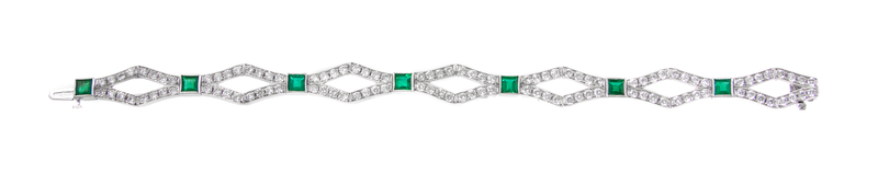 in an open chevron shape link design, containing seven square step cut emeralds weighing approximately 3.00 carats total and numerous round brilliant cut diamonds weighing approximately 7.00 carats total.Hand engraved: PLAT.