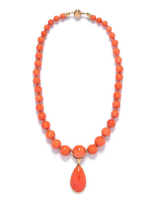 consisting of a strand containing 38 mottled orange coral beads measuring approximately 8.60-20.20 mm in diameter strung knotted with two fluted gold end caps and a fluted boule clasp, the strand supporting a detachable gold pendant containing one drop shape cabochon cut mottled orange coral measuring approximately 40.00 x 25.00 mm.Clasp stamp: ITALY 585.