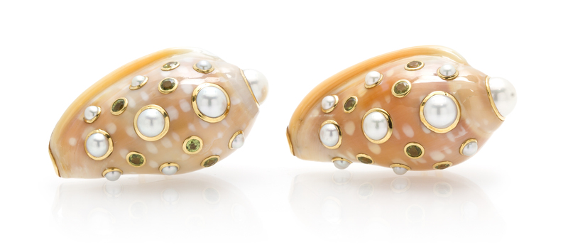 A Pair of 18 Karat Yellow Gold, Sapphire, Cultured Pearl and Shell Earclips, Trianon,