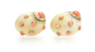 consisting of two cream color spiral shape shells surmounted with 14 gold bezel set round cabochon cut orange pink coral measuring approximately 2.80-4.67 mm in diameter.Stamp: TRIANON 750 37070 (maker's mark for Trianon).