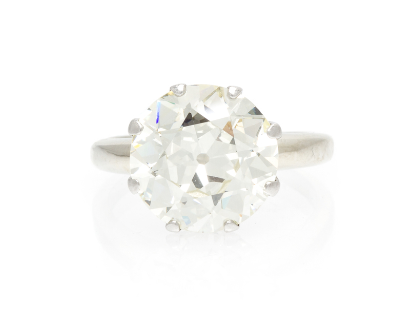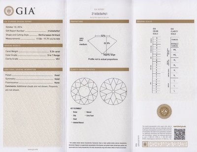containing one old European cut diamond weighing approximately 5.34 carats.Stamp: 14K. Accompanied by a Gemological Institute of America diamond grading certificate number 2165656961, dated October 10, 2014, stating Color: S-T, Clarity: VS1, Polish: Good, Symmetry: Good, Fluorescence: None.