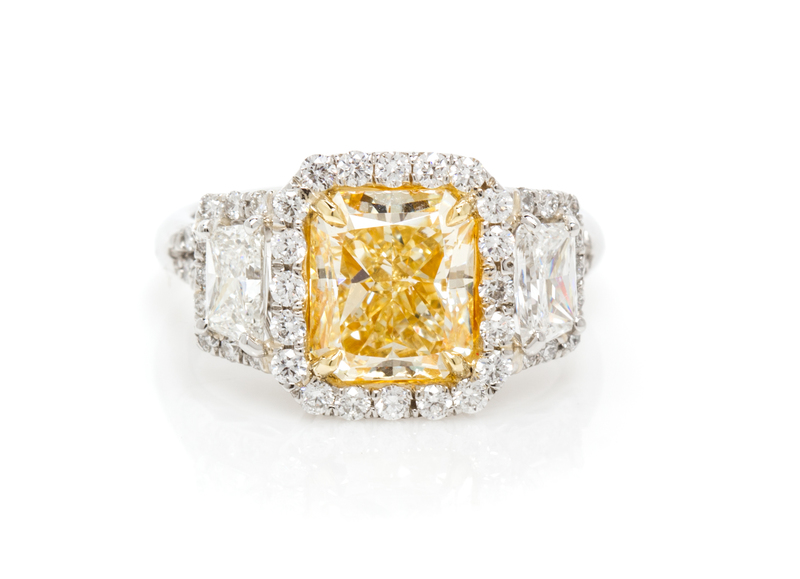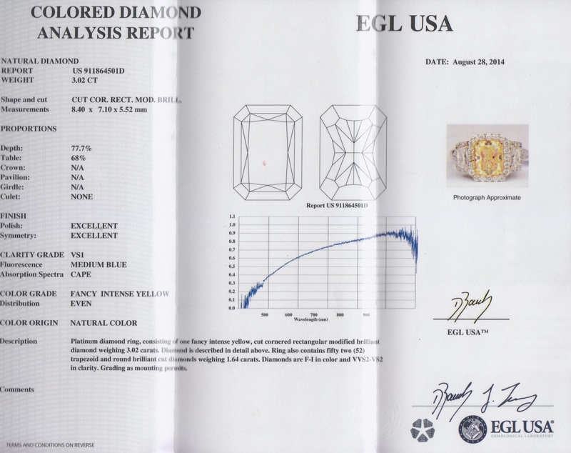 containing one radiant cut fancy intense yellow diamond weighing approximately 3.02 carats, together with two trapezoid brilliant and 50 round brilliant cut diamonds weighing approximately 1.64 carats total.Stamp: PT900.Accompanied by a European Gemological Laboratory USA colored diamond grading certificate number US 911864501D, dated August 28, 2014, stating Color Origin: Natural color, Color Grade: Fancy Intense Yellow, Even, Clarity: VS1, Polish: Excellent, Symmetry: Excellent, Fluorescence: Medium Blue.