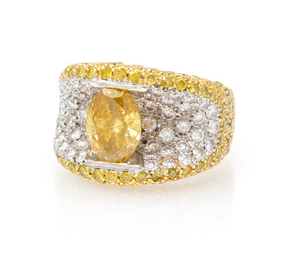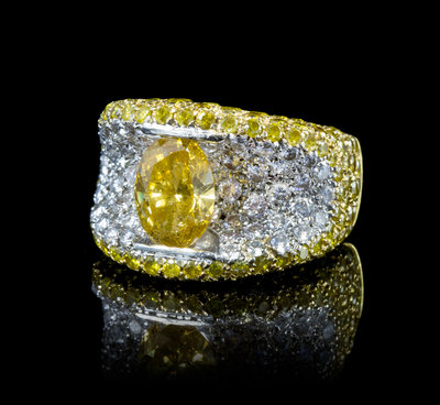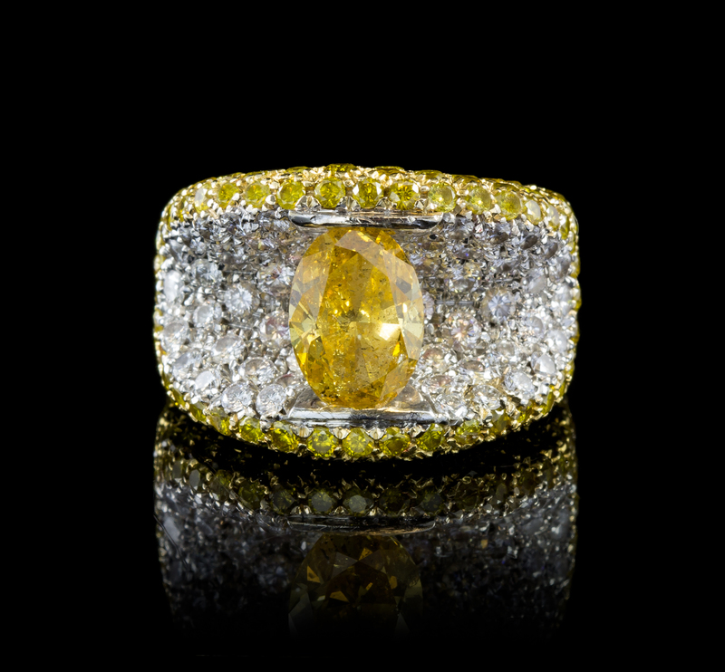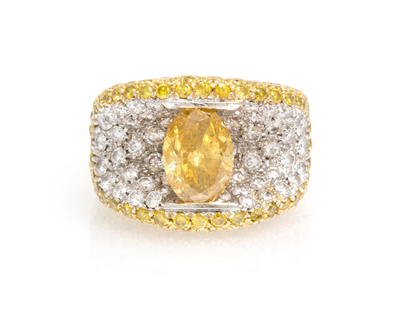 containing one oval brilliant cut yellow diamond measuring approximately 9.50 x 6.78 x 4.22 mm, together with numerous pave set round brilliant cut diamonds weighing approximately 1.65 carats total, and numerous round brilliant cut yellow diamonds weighing approximately 2.40 carats total within the concave design.Stamp: 800.NOTE: The colored diamonds in this ring have not been tested for origin of color.