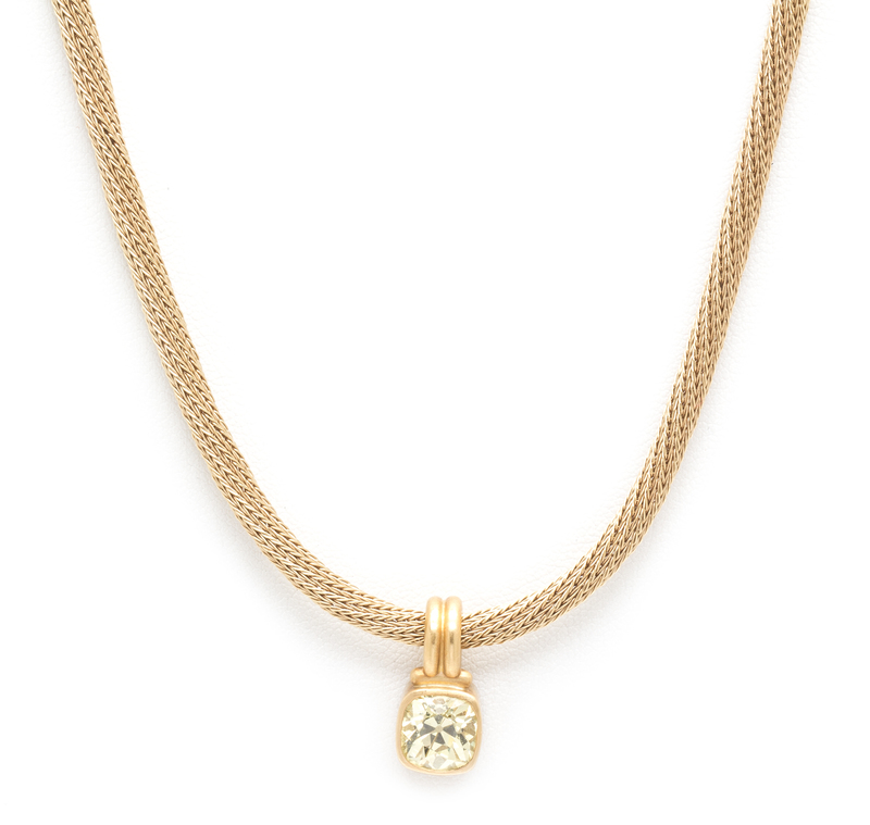 consisting of a matte finish gold bezel pendant with fluted bail containing one antique cushion cut light yellow diamond (origin of color not tested) weighing 2.29 carats, the pendant suspended from a 14 karat yellow gold twisted mesh link chain.NOTE: The diamond has a known weight of 2.29 carats.