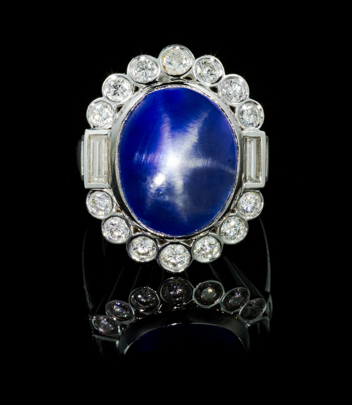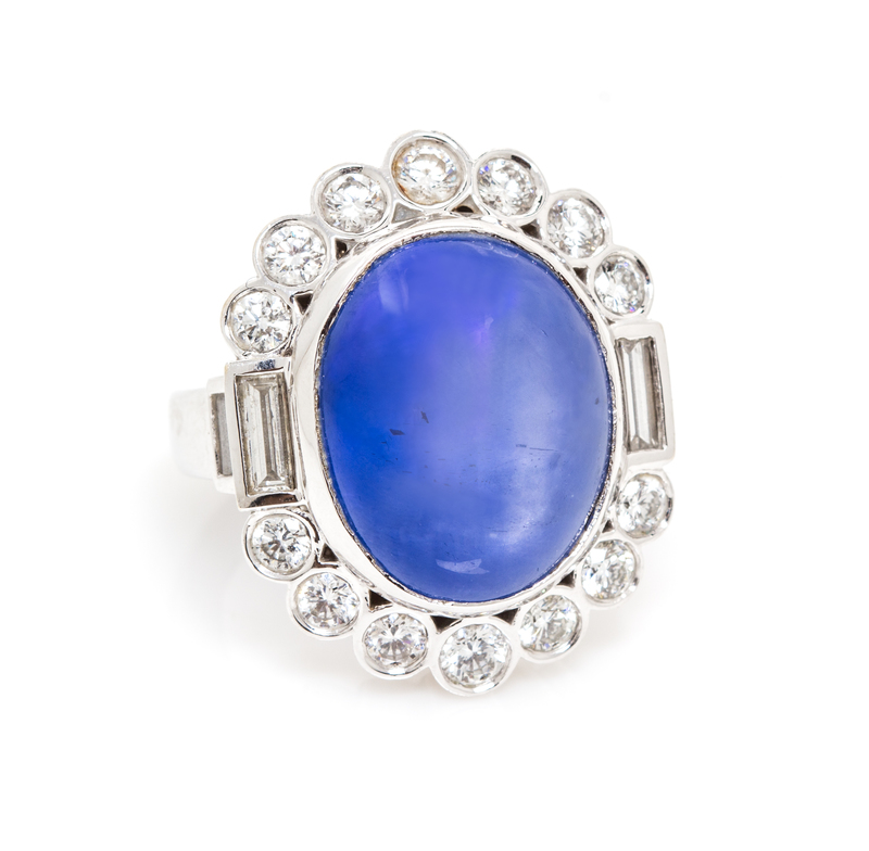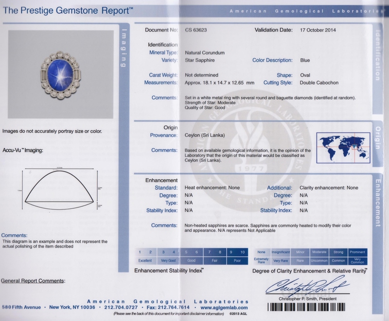 containing one oval double cabochon cut star sapphire measuring approximately 18.10 x 14.70 x 12.65 mm, four baguette cut diamonds weighing approximately 1.00 carat total and 14 round brilliant cut diamonds weighing approximately 1.80 carats total.Stamp: Ld.Accompanied by an American Gemological Laboratory sapphire identification and origin certificate number CS 63623, dated October 17, 2014, stating Mineral Type: Natural Corundum, Variety: Star Sapphire, Origin: Ceylon (Sri Lanka), Enhancement: None, Clarity Enhancement: None.