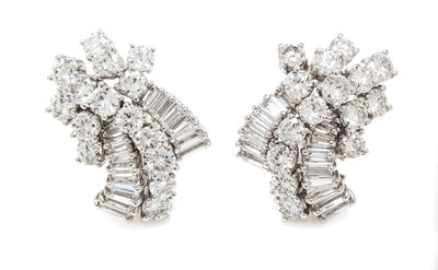 the spray design clips containing 30 round brilliant and 32 baguette cut diamonds weighing approximately 12.50 carats total, earclips measure approximately 27.00 x 20.00 mm.