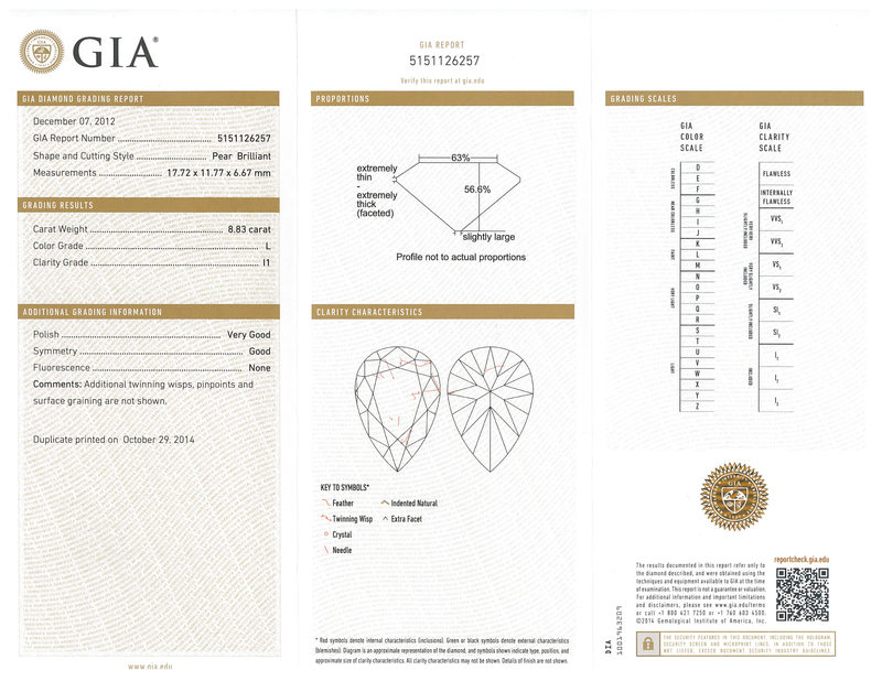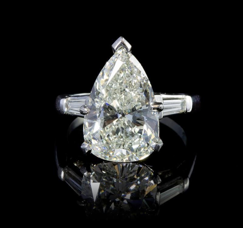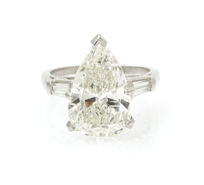 containing one pear shape brilliant cut diamond weighing approximately 8.83 carats and tapered baguette cut diamonds weighing approximately 0.40 carat total.Accompanied by a Gemological Institute of America diamond grading certificate number 5151126257, dated December 7, 2012, stating Color: L, Clarity: I1, Polish: Very Good, Symmetry: Good, Fluorescence: None.