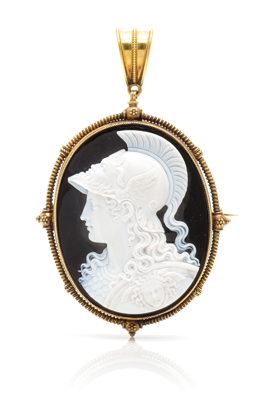 containing one oval onyx cameo of impressive intricacy depicting Athena wearing a Classical Athenian helmet with horsehair plume and a bearded winged male facade on the brim covering the flowing locks and leftward facing facade of the goddess, the scaled armor and elaborate shield with additional facade detailed below, the cameo measuring approximately 42.00 x 53.00 mm in a collet setting within a wire wrapped border enhanced at the compass points with granule and beaded accents, together with a detachable tapered bail, most likely original to the item, with rope texture allowing wear as pendant.Cameo engraving: 1880 Filippo Tignani Engraver Rome via Condotti, 91.