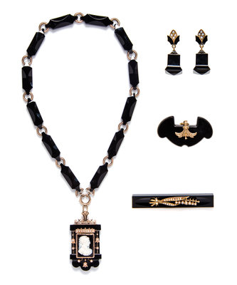 consisting of a necklace composed of alternating elongated and faceted onyx sections joined with rose gold jump rings with detachable pendant surmounted with an onyx cameo depicting a profile of an 18th century female surrounded by rose gold floral motif containing seed pearl accents and a glazed compartment on the reverse, a pair of dangle earrings with floral motif containing seed pearls and onyx inlay suspending two bell shape cut onyx, one onyx pendant brooch in the shape of a bat with rose gold foliate motif and one rectangular cut onyx with rose gold and seed pearl floral motif.