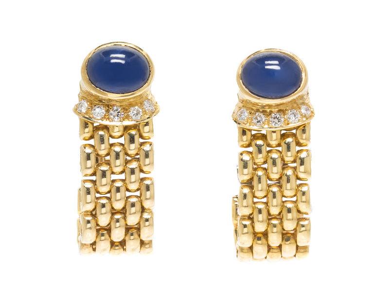 consisting of bezel tops containing two oval cabochon cut sapphires weighing approximately 5.60 carats total extending to the J-hoop design openwork mesh accented with 10 round brilliant cut diamonds weighing approximately 0.30 carat total.