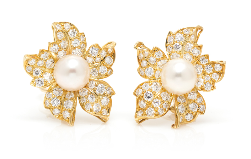 A Pair of 18 Karat Yellow Gold, Cultured Pearl and Diamond Flower Earclips,