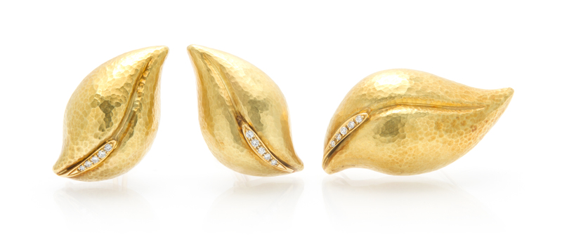 consisting of a pair of earring and matching brooch with hammered texture, containing 15 round brilliant cut diamonds weighing approximately 0.31 carat total.Stamp: PALOMA PICASSO TIFFANY & CO 18KT ITALY 89 750.