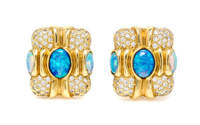the front of the necklace containing 17 oval cabochon cut crystal opals measuring approximately 6.50 x 5.00 mm within recessed collet links joined with fluted gold links and X links containing numerous round brilliant cut diamonds weighing approximately 0.84 carat total, the back chain composed of fluted and geometric motif links, together with a pair of matching earclips containing six oval cabochon cut crystal opals and numerous round brilliant cut diamonds weighing approximately 1.00 carat total.Stamp: 18K (maker's mark).