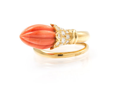 consisting of a slightly mottled pink orange carved coral section in a fluted bud motif affixed to a scalloped gold terminal containing 16 round brilliant cut diamonds weighing approximately 0.50 carat total above the spiral bypass design ring base.Stamp: FRANCE 18K 750 (French assay mark).