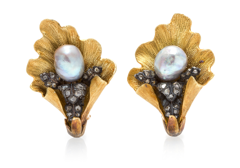 containing two baroque pearls measuring approximately 11.50 x 9.35 mm and 11.96 x 9.75 mm respectively, together with numerous rose cut diamonds within a hand engraved and fluted leaf motif setting of gold and oxidized silver.Hand inscribed: ITALY M. BUCCELLATI 96 750.Stamp: 750.