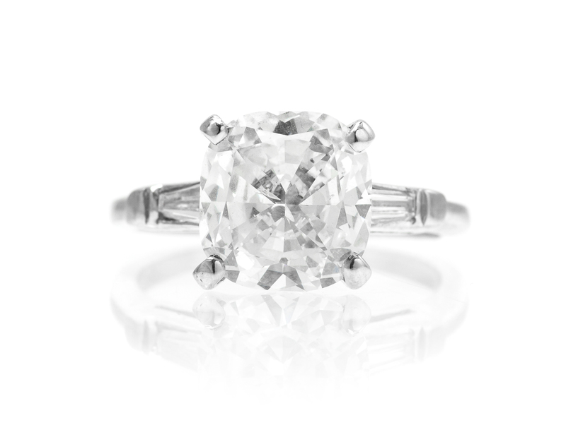 containing one cushion modified brilliant cut diamond measuring approximately 9.23 x 8.82 x 4.83 mm and two tapered baguette cut diamonds weighing approximately 0.26 carat total.Stamp: 14K.
