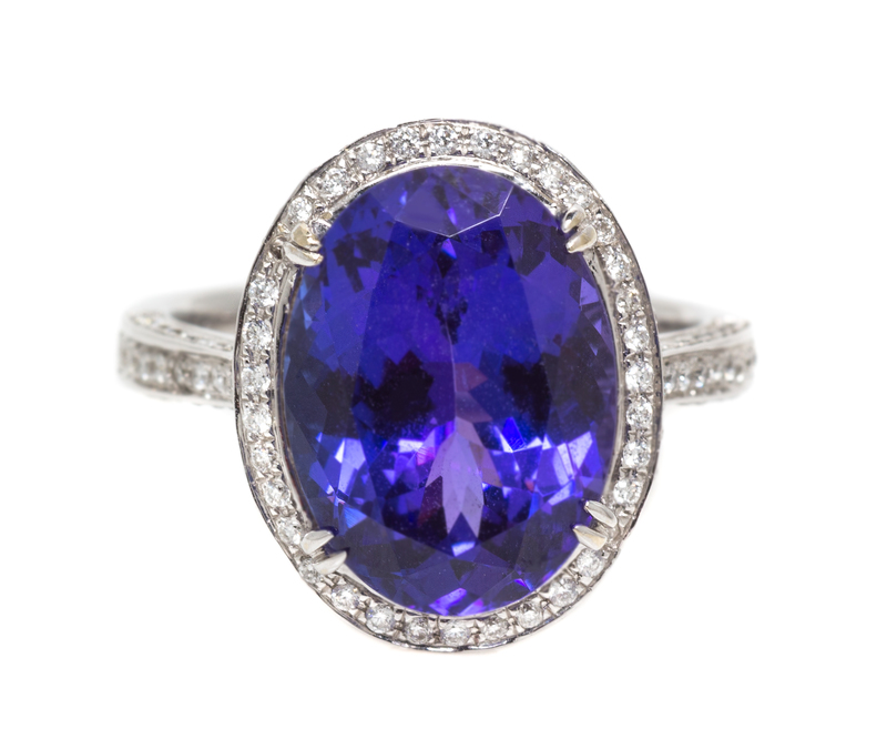 An 18 Karat White Gold Oval Cut Tanzanite and Diamond Ring,