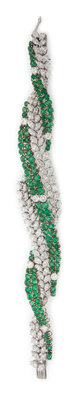 composed of alternating intertwined rows of emeralds and diamonds on the diagonal, containing 90 marquise shape brilliant cut diamonds weighing approximately 12.75 carats total, eight round brilliant cut diamonds weighing approximately 2.00 carats total and 104 round mixed cut emeralds weighing approximately 12.48 carats total.