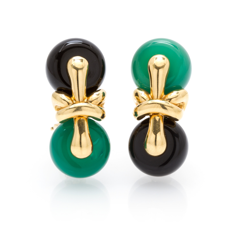 A Pair of 18 Karat Yellow Gold, Onyx and Dyed green Chalcedony Earclips, Marina B.,