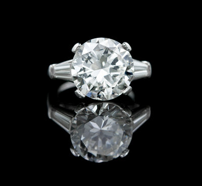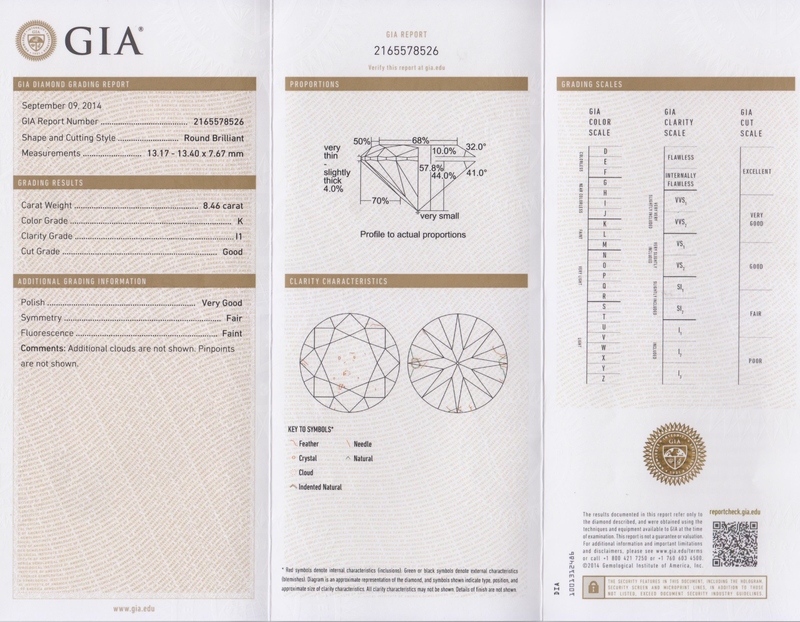 containing one round brilliant cut diamond weighing approximately 8.46 carats and two tapered baguette cut diamonds weighing approximately 0.90 carat total.Stamp: 10% IRIDPLAT.Accompanied by a Gemological Institute of America diamond grading certificate number 2165578526, dated September 09, 2014, stating Color: K, Clarity: I1, Cut: Good, Polish: Very Good, Symmetry: Fair, Fluorescence: Faint.