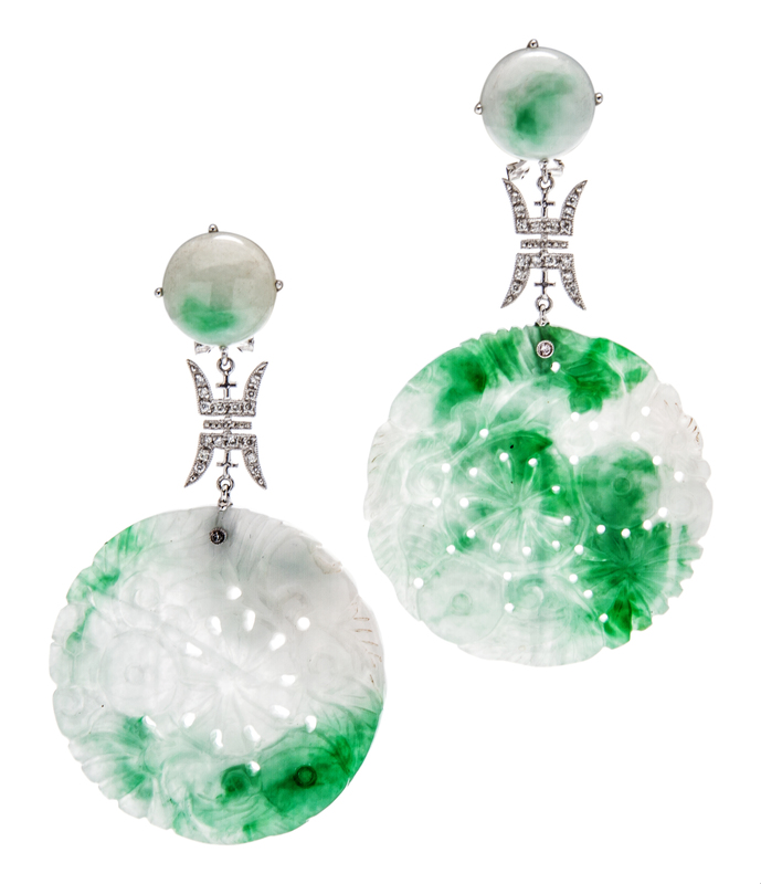A Pair of 18 Karat White Gold, Jade and Diamond Earrings,