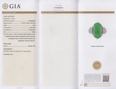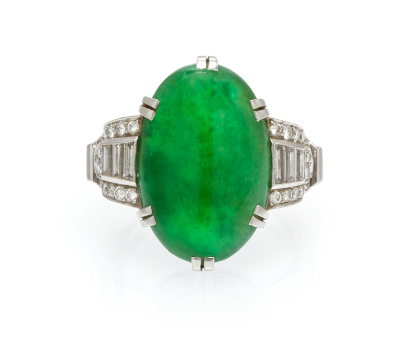 containing one oval cabochon cut jade measuring approximately 19.18 x 13.03 x 4.62 mm, six baguette cut diamonds weighing approximately 0.24 carat total, and 26 round brilliant cut diamonds weighing approximately 0.25 carat total, the setting accented with scrolled shoulders and a double gallery.Stamp: PEACOCK 900 PLAT 100 IRID.Accompanied by a Gemological Institute of America jade identification certificate number 2165582032, dated September 17, 2014, stating Species: Jadeite Jade, Treatments: Natural Color, no indications of impregnation.