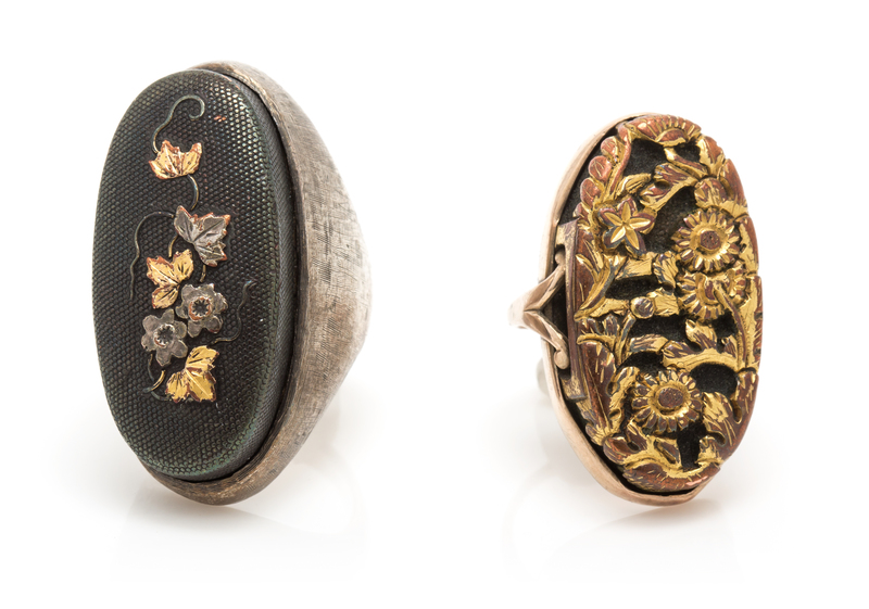 consisting of one silver tone ring containing an elongated oval kashira pommel in a crosshatched texture accented with a polychrome shakudo foliate design, together with a 10 karat rose gold ring containing an elongated oval kashira pommel encased within a shakudo openwork foliate motif surround.