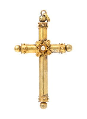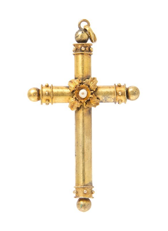 of golden hue, possibly rolled gold, surmounted at center with a quatrefoil leaf motif accent with seed pearl detail, the terminals with beaded accents.