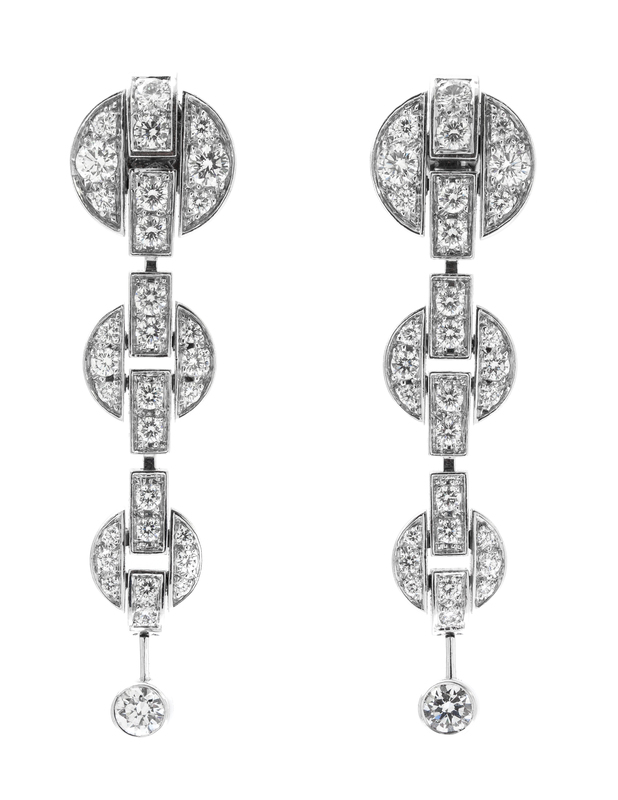 in a finely articulated and graduated semi-circular and bar link design, containing 62 round brilliant cut diamonds weighing approximately 2.40 carats total, the earrings measuring approximately 50.00 x 10.00 mm, locking post backs.Stamp: Cartier 750 71 929 B (French assay marks) (maker's marks).Accompanied by a red leather and gold leaf case signed Cartier.