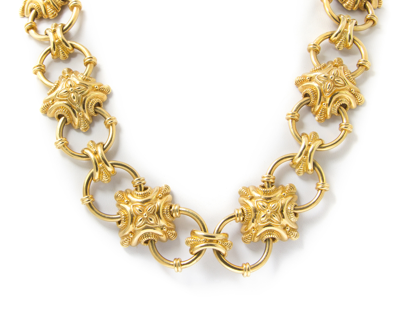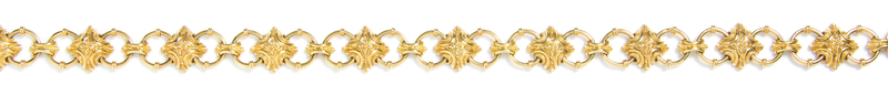 consisting of 13 domed compass point links with beaded foliate and fluted design joined with circular links and bands with fluted accents, the center link with a hidden suspension loop, measuring approximately 32.00 mm wide. Stamp: 18K.