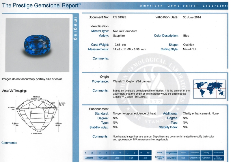 containing one cushion cut sapphire weighing approximately 12.65 carats and 14 old mine cut diamonds weighing approximately 2.10 carats total.Accompanied by an American Gemological Laboratories sapphire identification and origin certificate number CS 61923, dated June 30, 2014, stating Mineral Type: Natural Corundum, Variety: Sapphire, Origin: Classic Ceylon (Sri Lanka), Heat Enhancement: No gemological evidence of heat, Clarity Enhancement: None.