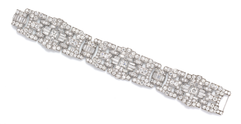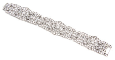 consisting of openwork links in a complex geometric motif, containing three old European cut diamonds weighing approximately 1.60 carats total, 274 old European cut diamonds weighing approximately 20.58 carats total, and 56 baguette cut diamonds weighing approximately 8.42 carats total, the bracelet measures approximately 28.00 mm wide.