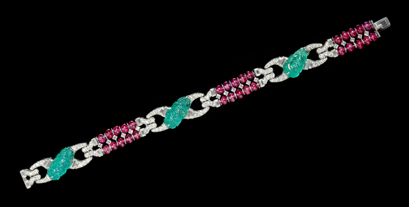 A Fine Art Deco Platinum, Diamond, Carved Emerald and Ruby Bead Bracelet,