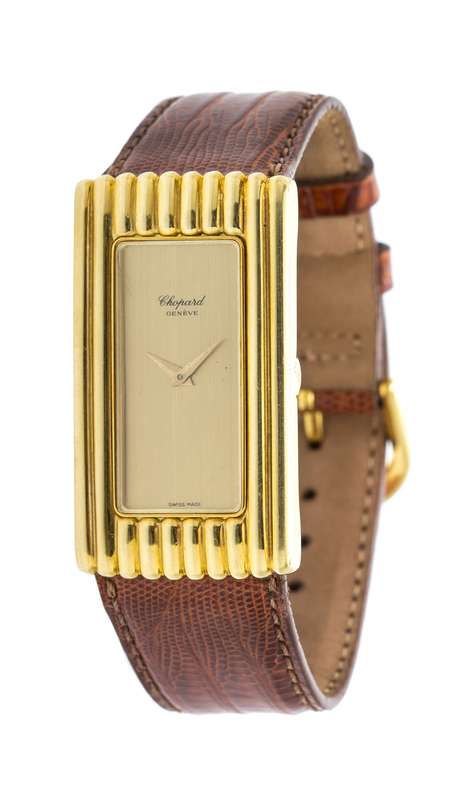 41.00 x 23.00 case dimensions, polished ribbed case, matte gold dial signed CHOPARD, gold dauphine hands, manual wind mechanical movement, case back affixed by four screws, brown lizard strap, goldtone buckle.
