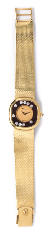 the articulated dial accent contains 10 round brilliant diamonds weighing approximately 0.30 carat total, 25.00 x 25.00 case dimension, matte gold inner dial signed Chopard, gold dauphine hands, cushion shape case, case back affixed with four screws, hand wound mechanical movement, gold mesh bracelet with foldover clasp.Case back stamp: 151912 5089 5.Clasp stamp: G 3479.