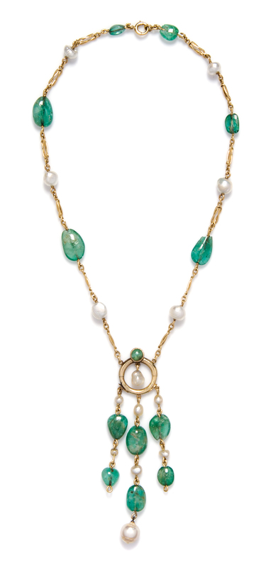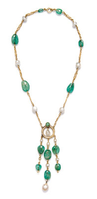 consisting of a central circlet section accented at the top with a millegrain edge bezel set round cabochon cut emerald and enclosing a hinged post set baroque pearl, the circlet supporting three drops containing six drilled emerald beads and seven baroque pearls strung on cable link chain, the circlet suspended from a station necklace composed of fancy interwoven link punctuated at regular intervals with six baroque pearls and six drilled emerald beads, the pearls measuring approximately 4.15-9.15 mm in diameter, the emerald beads measuring approximately 5.25-13.67 mm wide.Stamp: (French gold assay mark).