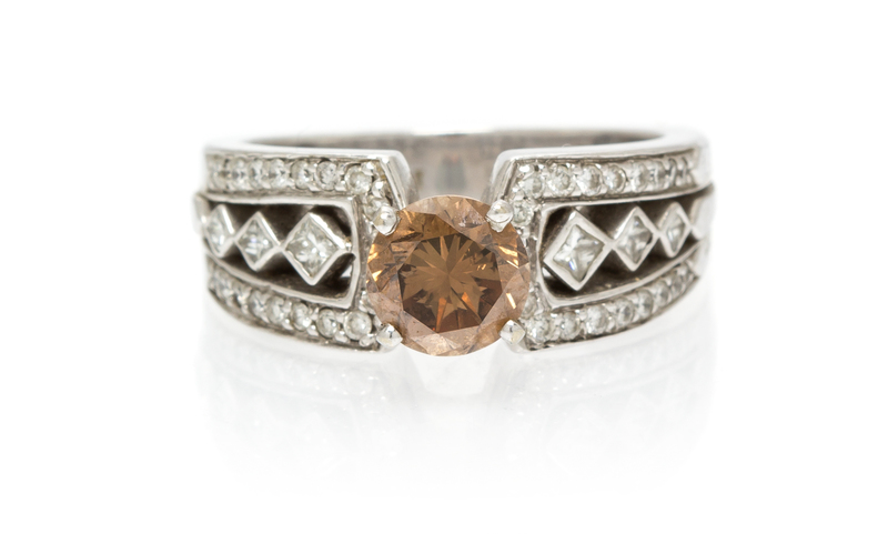 containing one round brilliant cut brown diamond (origin of color not tested) weighing approximately 1.58 carats total and 40 full cut diamonds and six princess cut diamonds weighing approximately 0.65 carat total.Stamp: 14K (partially obscured) MDI.